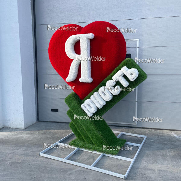 Буквы выполнены из металла и покрыты антикоррозийным полимером и декорированы искусственным газоном белого цвета.