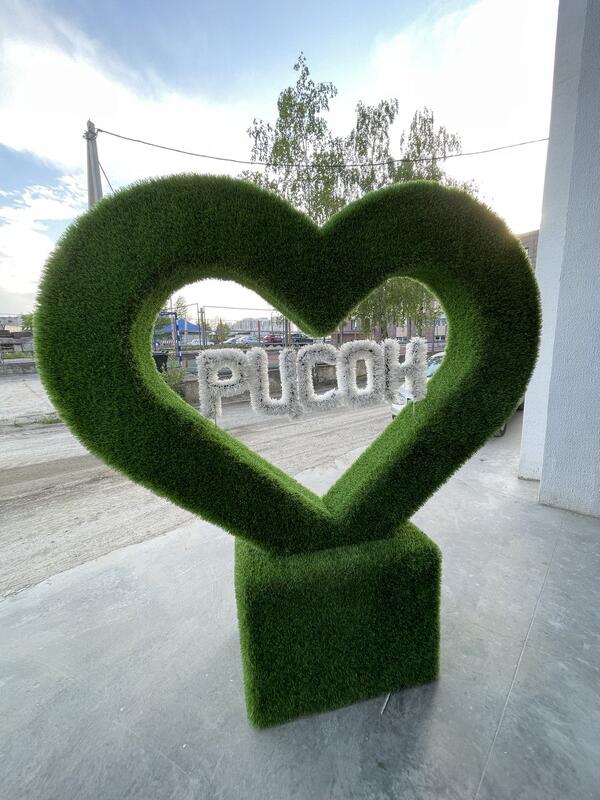 Надписи и буквы выполнены из металла и покрыты антикоррозийным полимером или искусственным газоном..