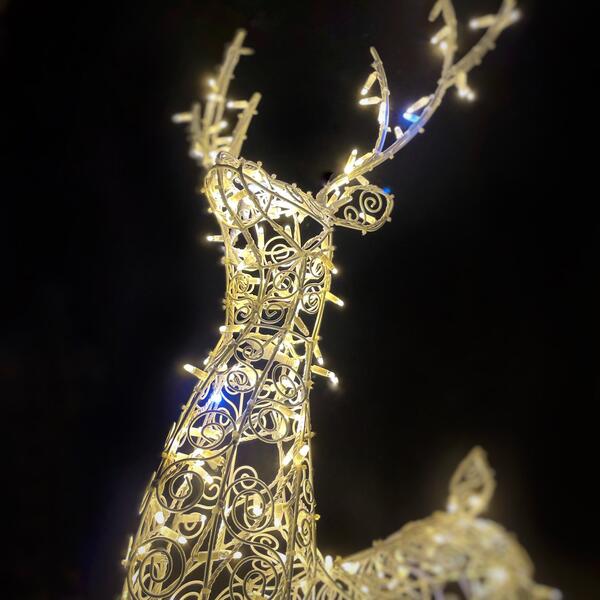 Материал Каркаса - сталь с двойным полимерным антикоррозийным покрытием. Цвет каркаса - белый. Каркас декорирован изящными ажурными завитками из металла. Внутри вплетены профессиональные яркие светодиодные гирлянды с высокой степенью защиты от влаги и пыли, прослужат долго. Каждый пятый диод мерцает, создавая приятное сияние. Блок подключения к сети в комплекте. Для удобства транспортировки и хранения рога оленя съемные. На каждой ноге оленя имеются крепежные элементы с отверстиями.