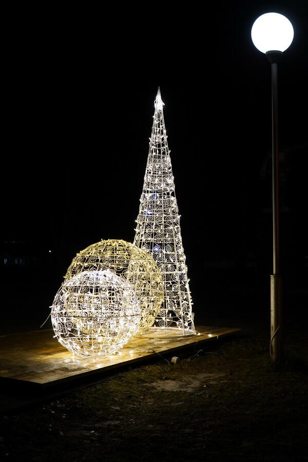 Простое по форме, классическое световое дерево-конус гармонично дополнит любую локацию,