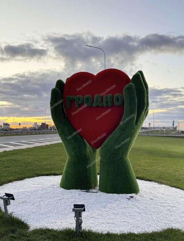 В основе композиции лежит прочный металлический каркас покрытый антивандальным стеклопластиком. Фигура декорирована густым качественным ярким газоном зеленого и красного цвета. Покрытие не выцветает, не боится влаги, хлора, высоких и низких температур. Не требует ухода.