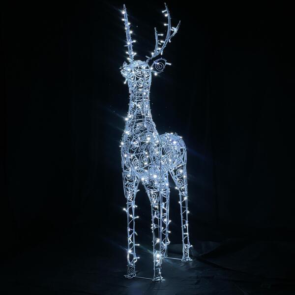 Материал Каркаса - сталь с двойным полимерным антикоррозийным покрытием. Цвет каркаса - белый. Каркас декорирован изящными ажурными завитками из металла. Внутри вплетены профессиональные яркие светодиодные гирлянды с высокой степенью защиты от влаги и пыли, прослужат долго. Каждый пятый диод мерцает, создавая приятное сияние. Блок подключения к сети в комплекте. Для удобства транспортировки и хранения рога оленя съемные. На каждой ноге оленя имеются крепежные элементы с отверстиями.